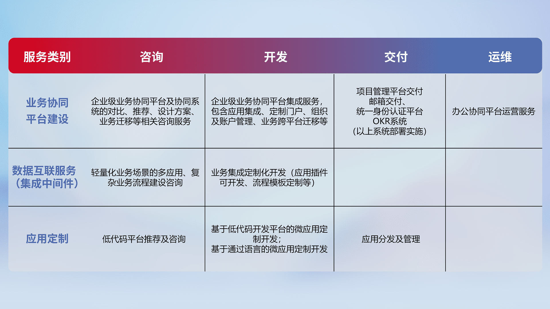 针对钉钉、、、企微、、、IDaas等平台级产品提供产品的规划、、、、方案、、交付、、定制化开发等服务,,,实现如统一协同办公、、、智能客户服务、、、、混合会议管理、、、智能数据查询、、、、等业务场景,,,实现数字化转型。。。。